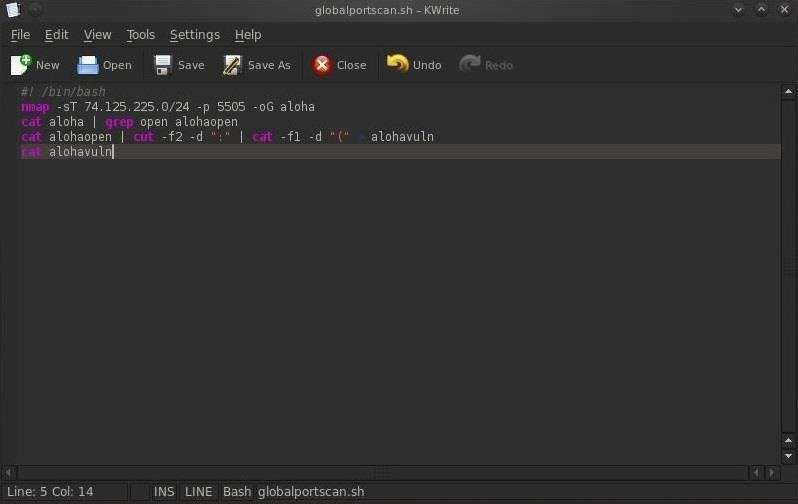 Now we need to type the following lines in our script file.The required opening of all BASH scripts.- nmap -sT 74.125.225.0/24 -p 5505 -oG aloha