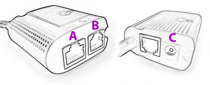 2) Connect your Ethernet network cable to port (A) on the opposite side of the power connector