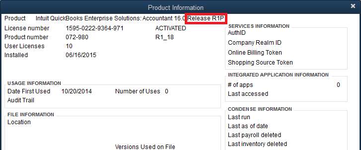 Choose Help > Product Information. Version and release information appear. For example, if it shows Product: QuickBooks Pro 2015 for Mac R3, the version is 2015 and the release is R3. QuickBooks Pro, Premier, or Enterprise SolutionsThe product edition and version appear in the title bar, at the top of the product window.Press F2 to open the Product Information window. Version, edition, and release appear at the top of the window, on the Product line.If you cannot open QuickBooks to find the Product InformationPress and hold the CTRL key, and then double-click the QuickBooks icon on your desktop. Continue pressing the CTRL key until you see the No Company Open window, then release the CTRL key.If QuickBooks still does not open: