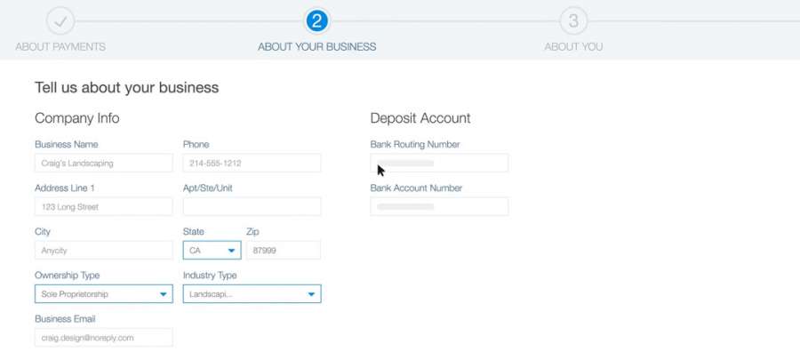 Enter information about your business including the bank account where you want your customers’ payments to be deposited.