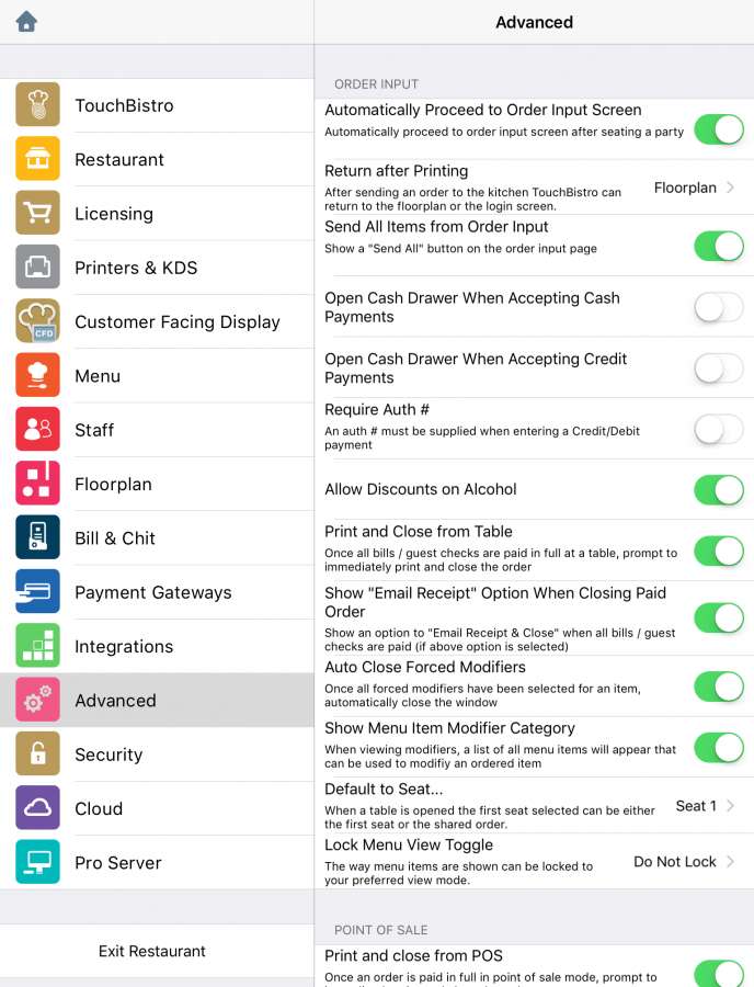 Chapter 1. AdvancedTap Advanced to fine tune TouchBistro to your operational specifics. TouchBistro has set the most likely defaults. Under Advanced you can override those defaults. Tap and scroll up on the Advanced settings screen to reveal additional settings.Section 1. Order Input Custom Settings