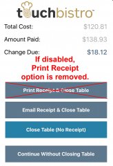 This option only controls the receipt options when you cash out a table. If toggled off, TouchBistro will not display the options to print the receipt. |
