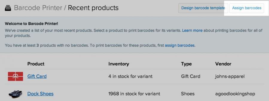 Assign barcodes to your productsYou can assign barcodes to your products using either or both of the following methods:Assign barcodes automaticallyUse the Barcode Printer app to automate the creation of unique barcodes for your products:From your Shopify admin, click Apps (or press G A):Click the icon for the Barcode Printer app.After the app opens, click Assign barcodes:Choose one of the following:Assign barcodes only to products without barcodes. This generates barcodes for any of your products that don't already have barcodes.Overwrite all existing barcodes.