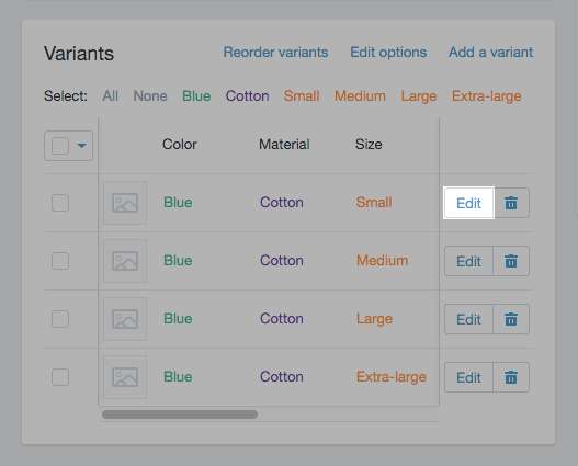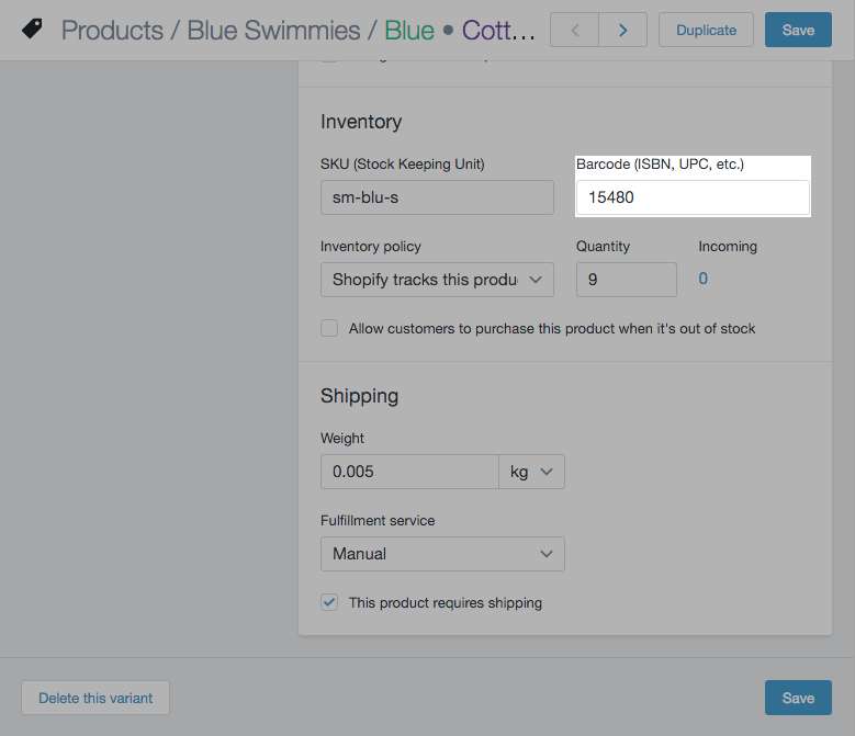 To add or change a barcode by editing an existing variant:From your Shopify admin, click Products (or press G P P):Click the name of a product:In the Variants section, click Edit for a variant:Add or edit the barcode for the product variant:Click Save.How helpful was this page?