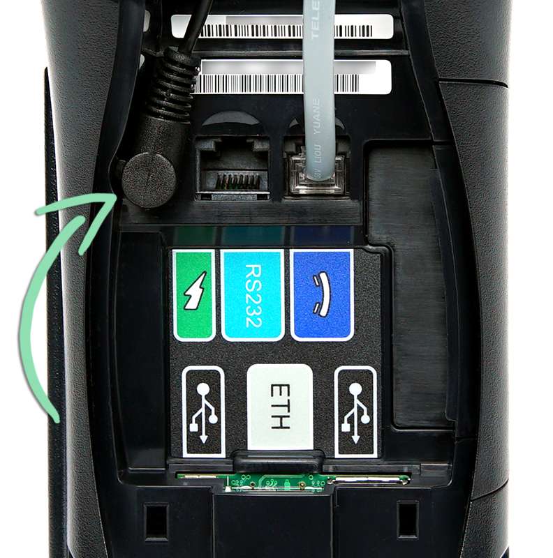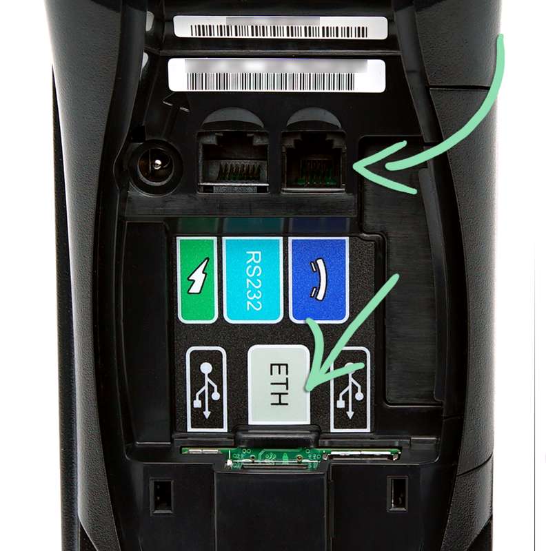 - Connect an ethernet cable to the 'ETH' port OR the included telephone line cable to the phone port.An ethernet connection is recommended for faster transaction speed.