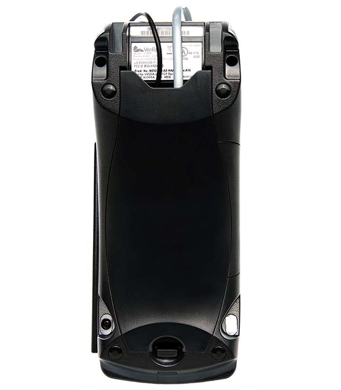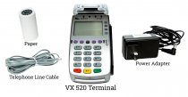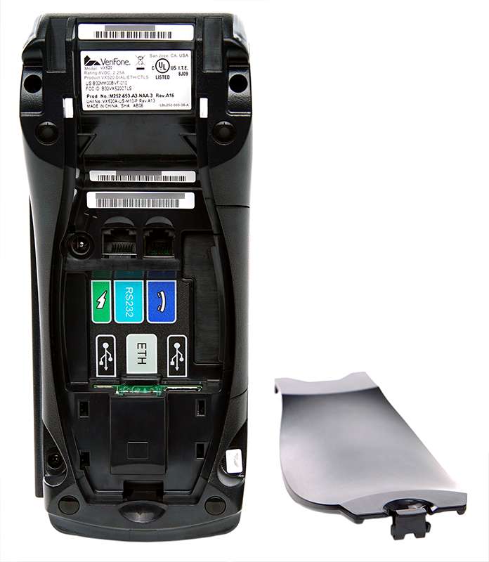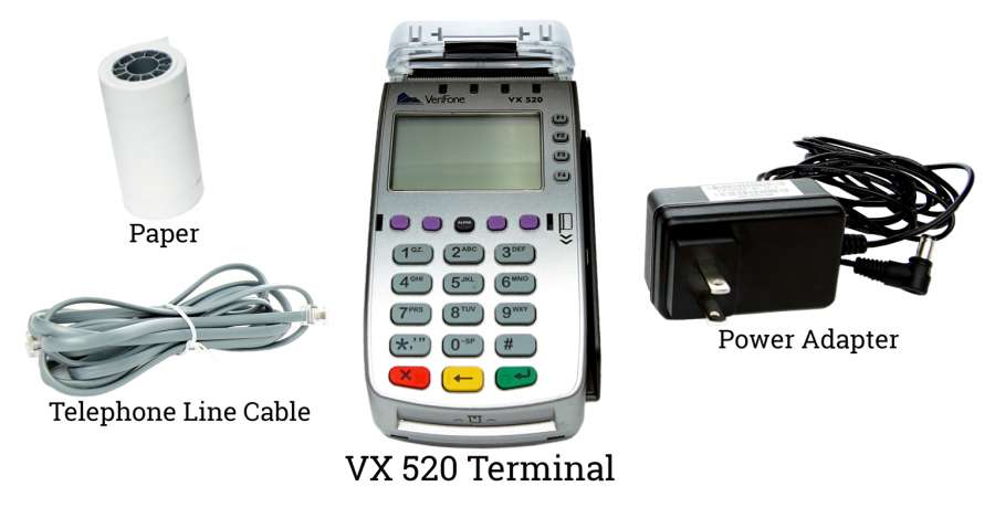 The Verifone VX 520 ships with a power adapter, telephone line cable, and roll of thermal paper.Connect the TerminalThe credit card terminal needs an ethernet or phone line connection to be able to communicate with the processor and run transactions.*Ethernet cable must be purchased separately.- Remove the cover from the bottom of the terminal.