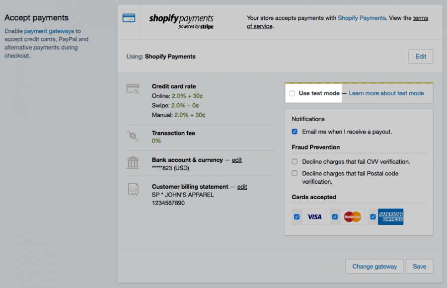 To test the setup and configuration of your Shopify Payments gateway: